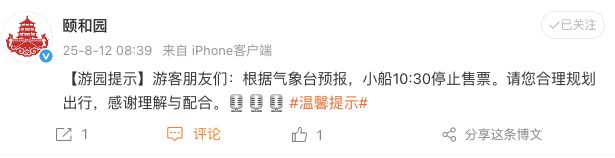 根据气象站的预测,该船将在10:30停止售票。合理地计划您的旅行,并感谢您的理解与合作。 Beihai公园的官方微博:亲爱的旅游者,由于强烈的蓝色警告,公园巡游将在上午10点停止售票销售。 Zizhuyuan Park的官方微博:由于天气,Zizhuyuan Park Cruise项目已被暂停。资料来源:@Summer Palace @beihai Park @Beijing Zizhuyuan Park编辑:Wujuan BRTV新闻新闻的BRTV新闻